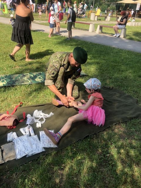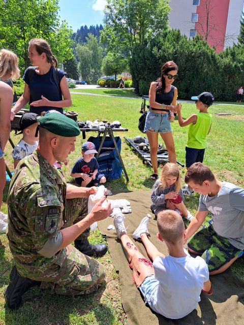 V rámci podujatia prispeli aj naši traja príslušníci práporného obväziska 11. mechanizovaného práporu Martin. Profíci z jedenástky našim najmenších ukázali zaujímavé spôsobilosti ako praktické ukážky zo zdravotníckej prípravy - ošetrovanie zranení, zlomenín, tržných rán, popálenín a v neposlednom rade poskytovanie prvej pomoci pri zástave dýchania a činnosti srdca na umelých figurínach. Okrem týchto zručností si mohli deťúrence pozrieť a vyskúšať vojenskú výstroj s kamuflážou tváre.