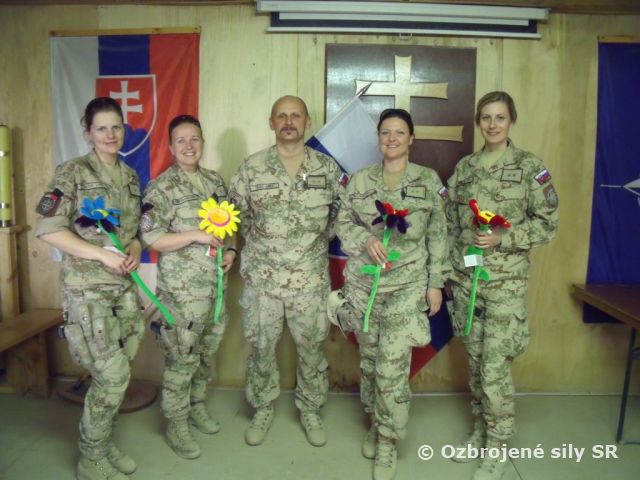 Aj v operácii ISAF na leteckej základni Kandahár Air Field v Afganistane si naši vojaci spomenuli na svoje kolegyne, ktoré ako historicky prvé ženy – vojačky slávia tento sviatok žien tu na tomto mieste ďaleko od domova a svojich blízkych. Aspoň takouto malou umelou kytičkou, sladkosťou a skromným pohostením sme chceli vyjadriť našim kolegyniam a našim dievčatám, ako ich tu familiárne oslovujeme, že si ich vážime a že svojou prítomnosťou vnášajú aspoň kúsok ženského šarmu a elegancie medzi našich tvrdých slovenských chlapov, akými naši vojaci nepochybne sú.