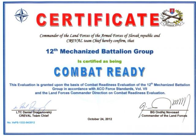 Cvičenie Fort Pribina II bolo ukončené odovzdaním certifikátu "Combat ready" pre 12. mechanizovanú práporovú skupinu. Najlepšie zábery z tohto cvičenia si môžete pozrieť vo fotogalérii. Fotogaléria