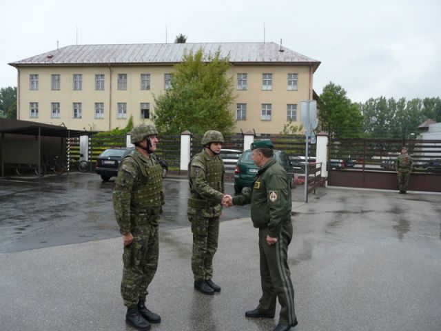 Na pôde Považských kasární brigádneho generála podaním hlásenia privítali veliteľ základne podplukovník Štefan Pobijak a jeho zástupca major Aurel Sabó.