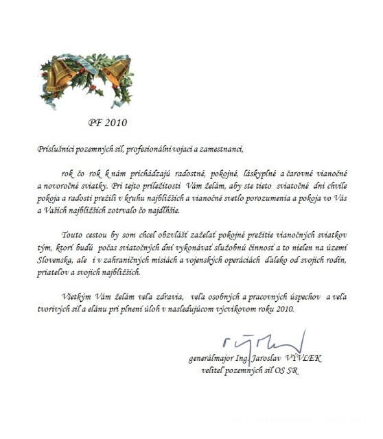 Príslušníci pozemných síl, profesionálni vojaci a zamestnanci, rok čo rok k nám prichádzajú radostné, pokojné, láskyplné a čarovné vianočné a novoročné sviatky. Pri tejto príležitosti Vám želám, aby ste tieto sviatočné dni chvíle pokoja a radosti prežili v kruhu najbližších a vianočné svetlo porozumenia a pokoja vo Vás a Vašich najbližších zotrvalo čo najdlhšie.