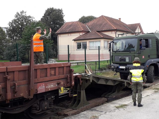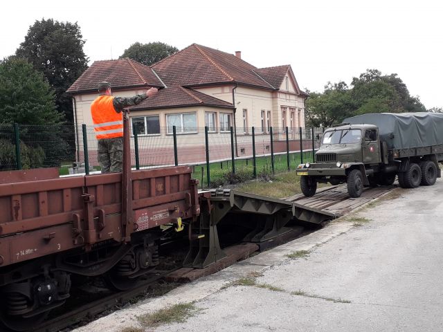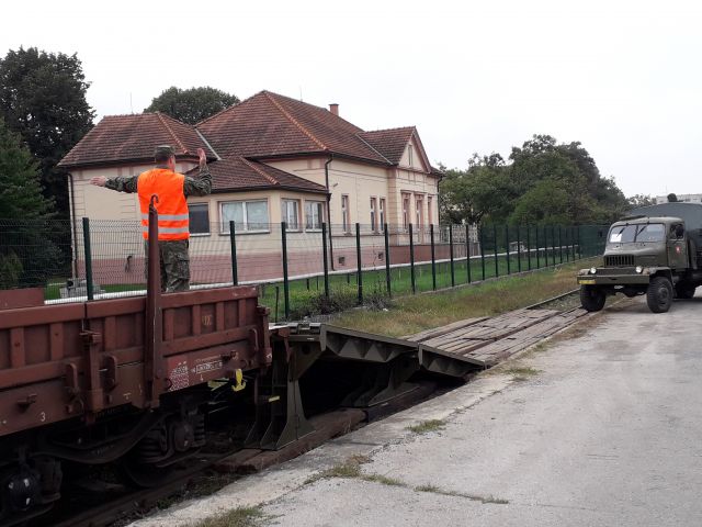 Po výstavbe rampy nasledovala skúška v podobe prechodu nákladnej techniky cez vagóny, ktorú navádzali v rámci výcviku príslušníci práporu.