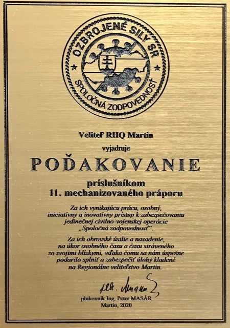 „Príslušníci 11. mechanizovaného práporu Martin v tomto pandemickom období, s plným nasadením a odhodlaním, bojujú proti ochoreniu COVID-19. Mnohými zverenými úlohami, prispievajú k prekonaniu krízy v súvislosti s celosvetovou pandémiou.